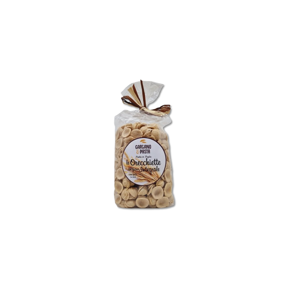 Orecchiette rustiche ottenute a partire da un impasto di semola di grano duro integrale e semola di grano duro. L'elevato tenore di fibre alimentari presenti nella farina integrale e il processo di essiccazione a bassa temperatura garantiscono un maggiore contenuto di sostanze nutritive (soprattutto amminoacidi essenziali e Vitamine del gruppo B ed E) ed una lunga serie di proprietà benefiche: maggiore senso di sazietà, minore contenuto glicemico e calorico, migliore transito intestinale, maggiore riassorbimento di grassi e colesterolo.