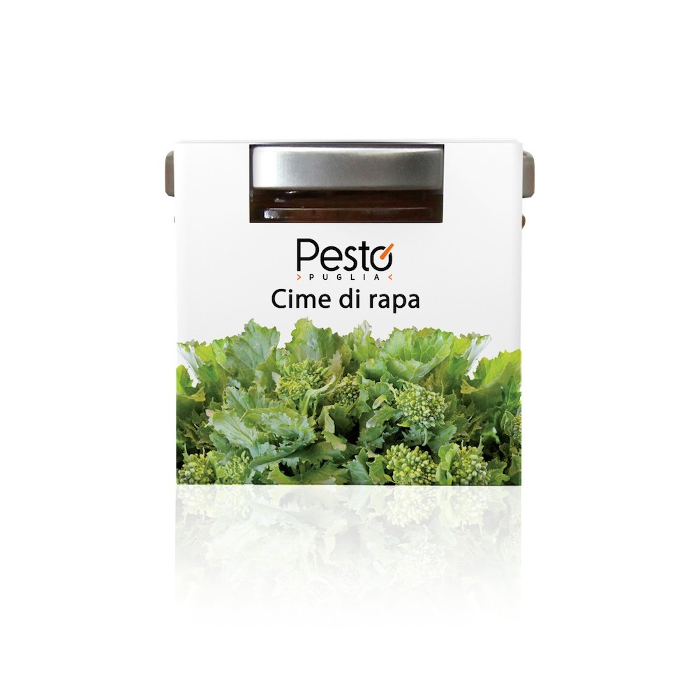 Pesto ottenuto artigianalmente dalla verdura (cime di rapa) fresca e di stagione, lessata e condita con olio. Ideale per preparare la ricetta simbolo della cucina pugliese: orecchiette alle cime di rapa.