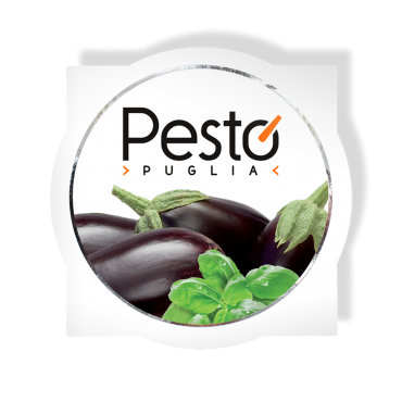 Pesto ottenuto artigianalmente da melanzane e basilico e condito con olio extravergine di oliva. Condimento versatile può prestarsi a diversi usi in cucina.