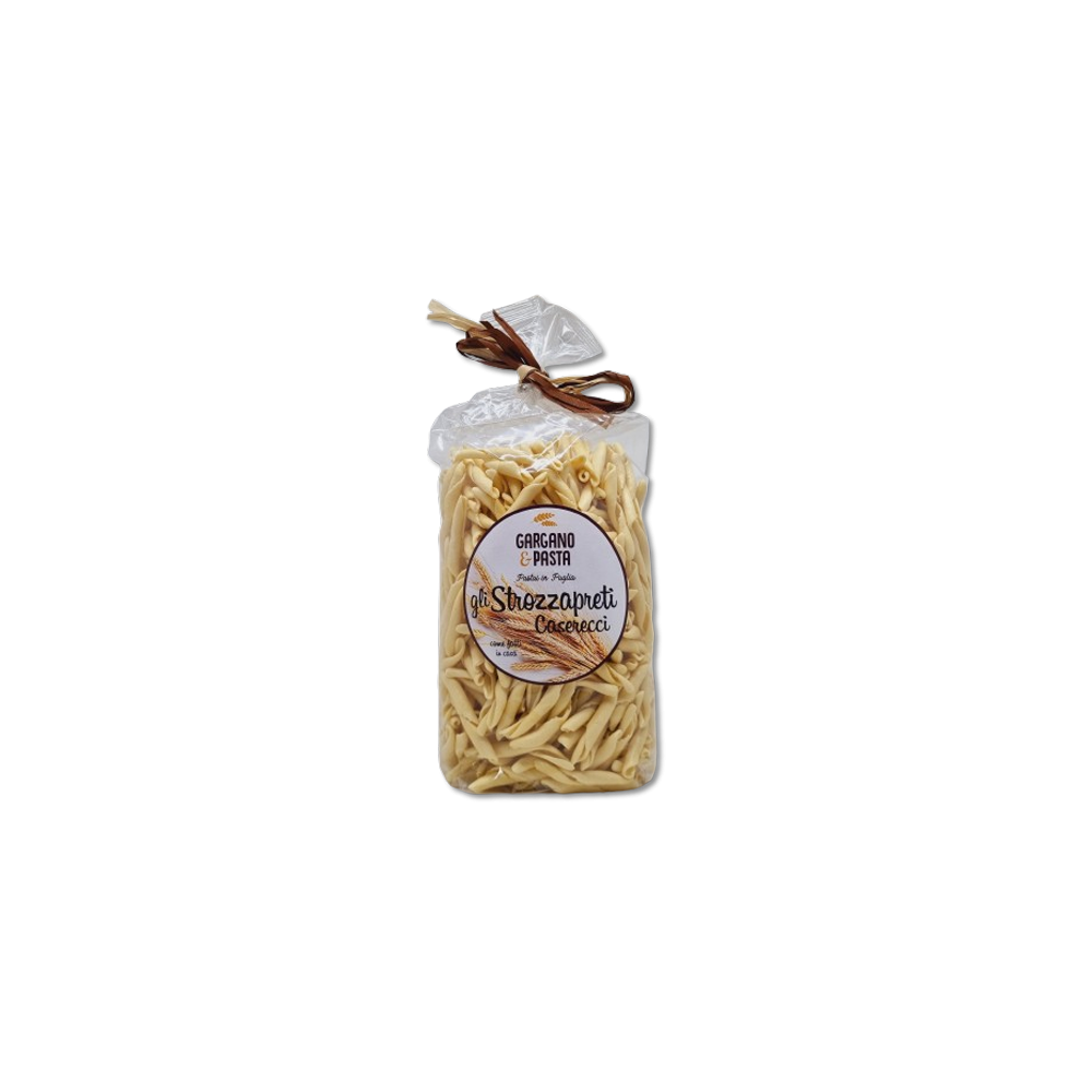 Gli strozzapreti, secondo la tradizione pugliese, sono degli spaghetti di colore giallo dorato lunghi 6-7 centimetri, avvolti ad elica su un ferro a sezione quadrata. Questa pasta artigianale deve il suo nome ad una presunta avidità del clero nel mangiare piatti preparati con questo formato dalla buona consistenza, a tal punto che il prete ne sarebbe rimasto strozzato!