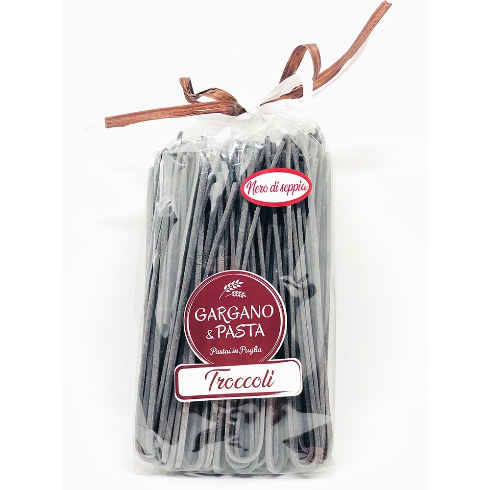 Tra le tante ricette marinare, quella dei troccoli al nero di seppia presenta un fascino particolare che nasce dal loro colore nero intenso e dal loro caratteristico aroma. Realizzati con ingredienti naturali, semola di grano duro e nero di seppia aggiunto all'impasto, senza l’aggiunta di coloranti. Indicati con sughi leggeri a base di pesce, verdurine e frutti di mare.